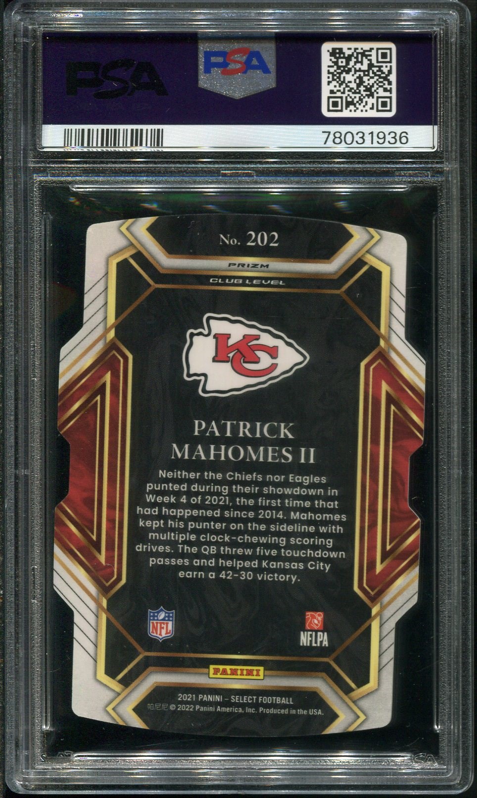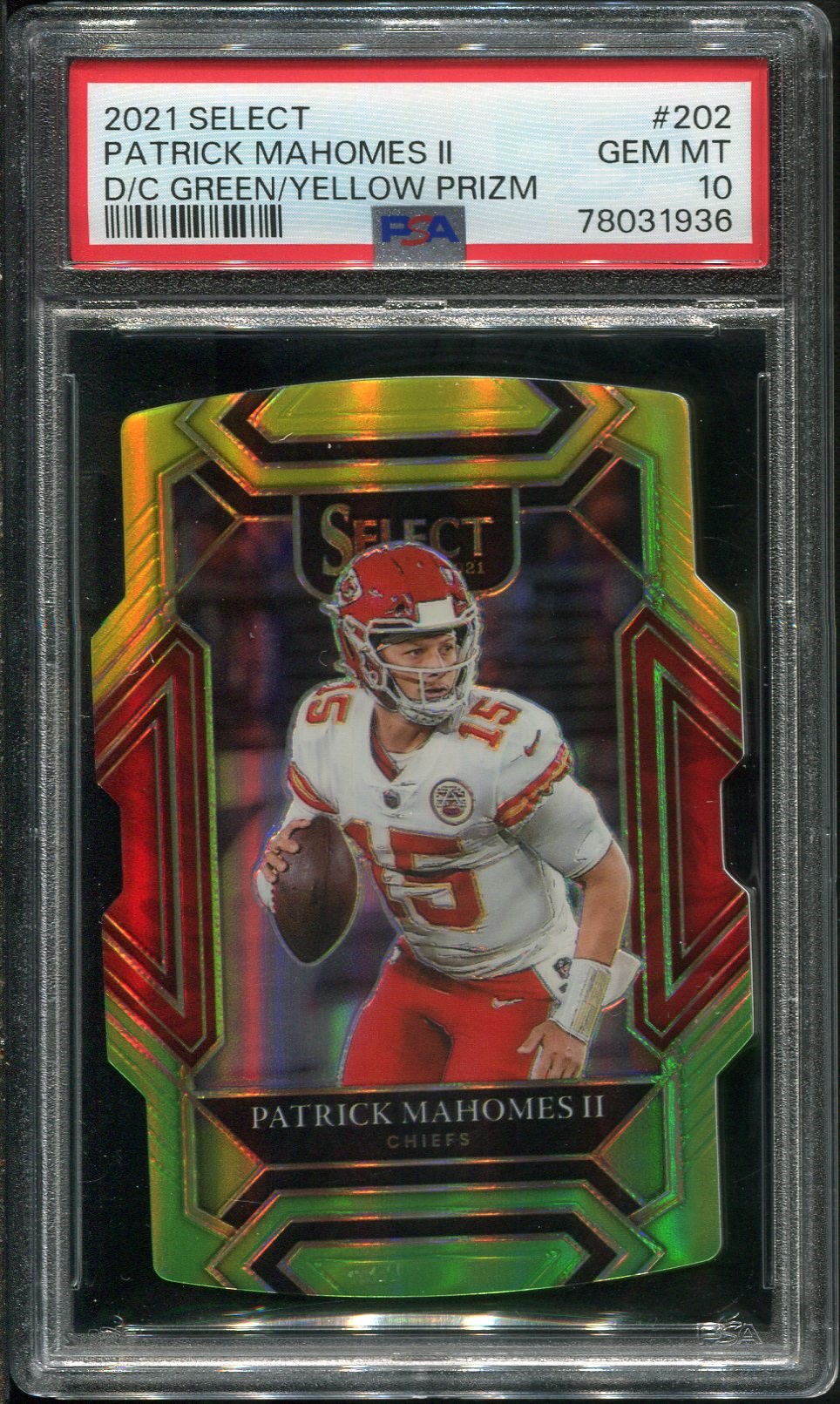 2021 Panini Select Patrick Mahomes Die-Cut Green/Yellow Prizm #202 PSA Gem Mint 10 - A low PSA population card that comes in a scratch free PSA holder.