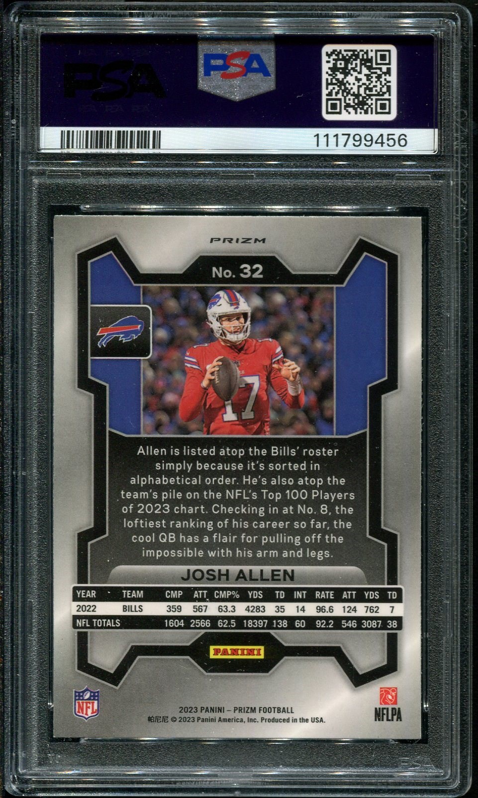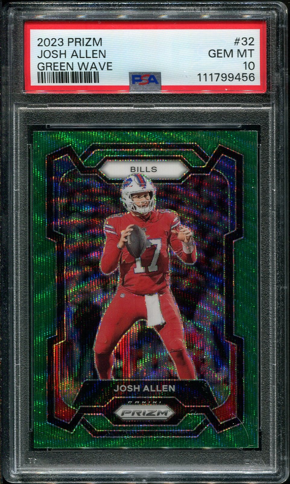 2023 Panini Prizm Josh Allen Green Wave Prizm #32 PSA Gem Mint 10 (Pop 37) - A low PSA 10 population and attractive Prizm design make this a must have card.