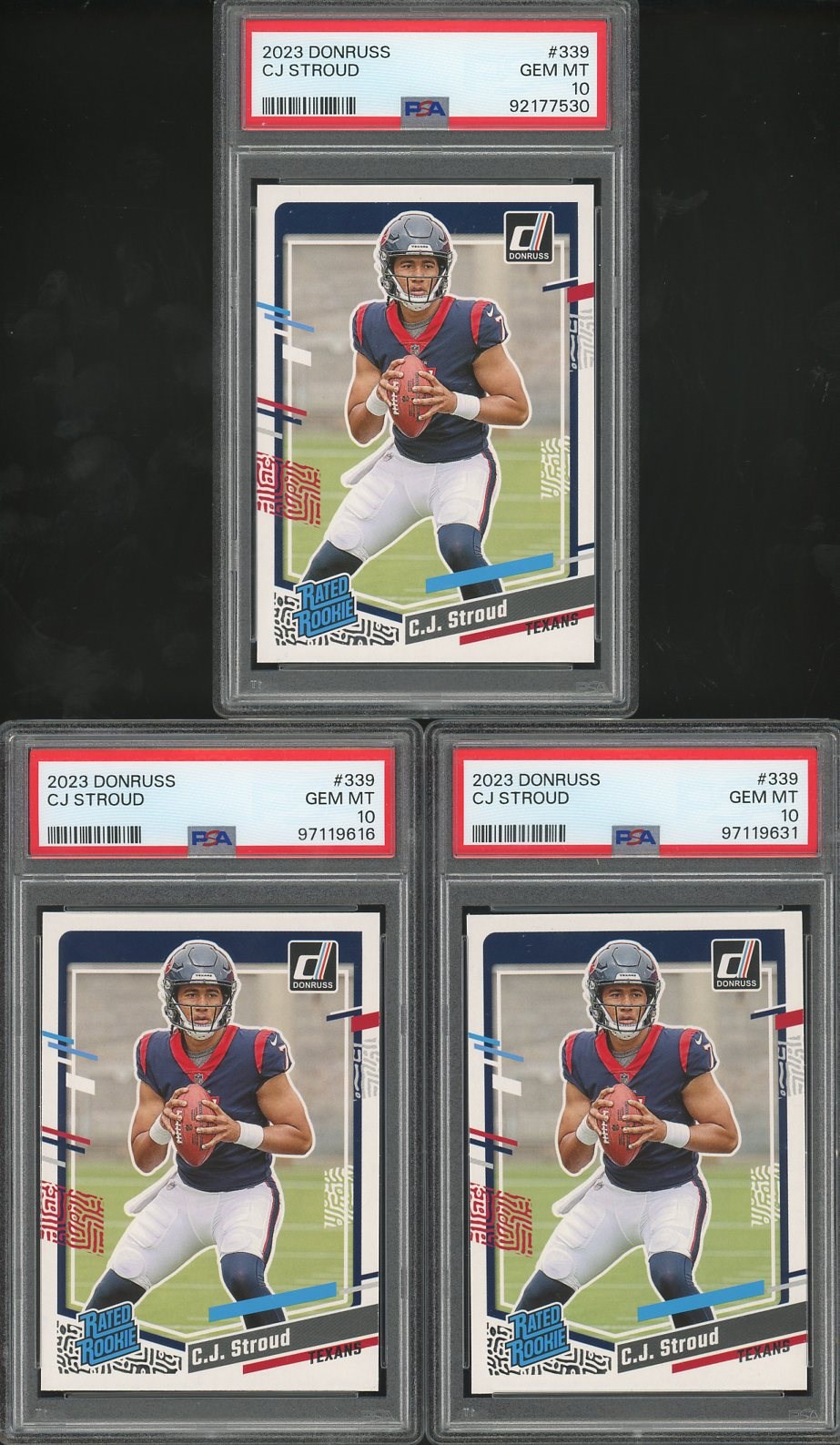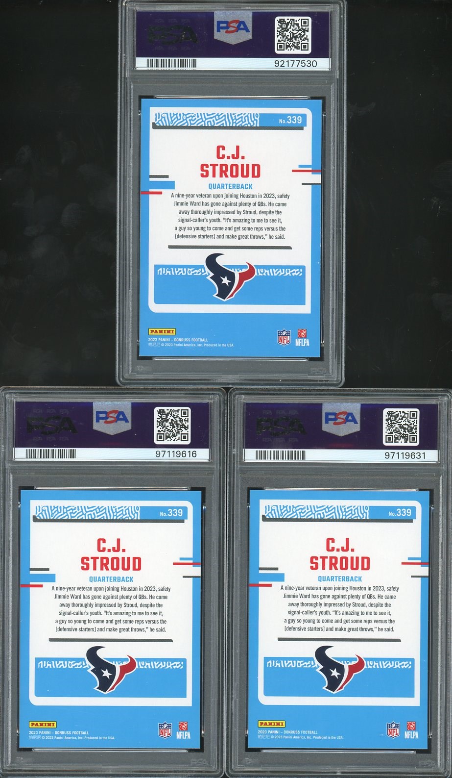 2023 Panini Donruss CJ Stroud RC #339 Lot of 3 All are PSA Gem Mint 10's - Here is a chance to get three PSA 10 Stroud's all in one lot. He has played great in the second half of the season, putting the Texans on the verge of the playoffs.