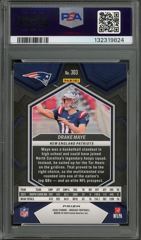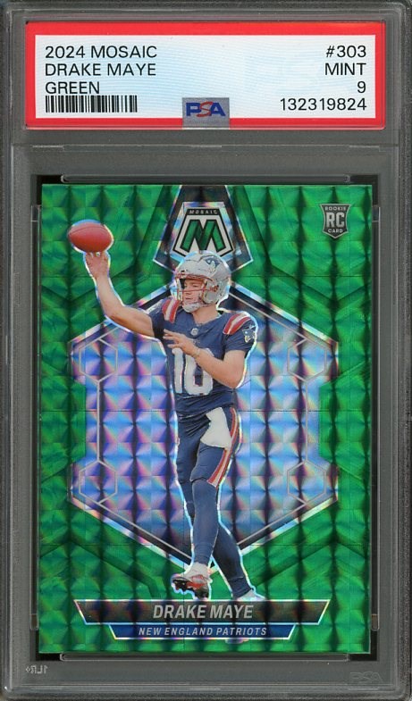 2024 Panini Mosaic Drake Maye Green Mosaic RC #303 PSA Mint 9 - An attractive card of Maye in a new PSA holder.