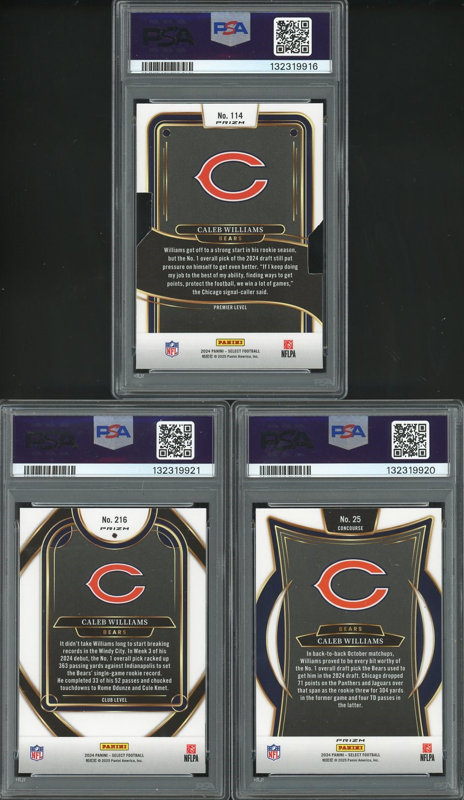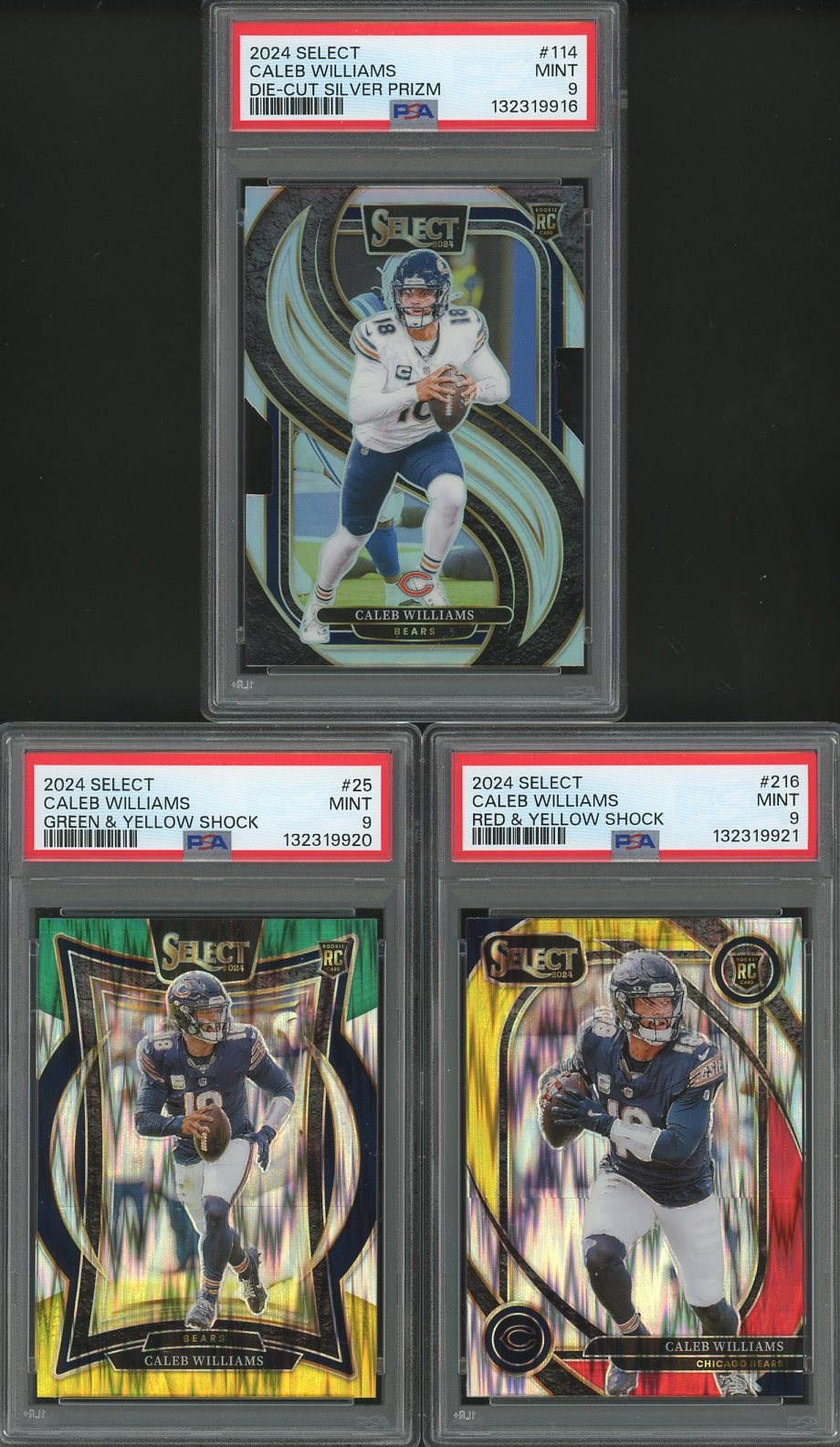 Caleb Williams Lot of 3 Different 2024 Panini Select Parallel RC's All PSA Mint 9's - Get his 2024 Panini Select Green & Yellow Shock Prizm RC #25, 2024 Select Die-Cut Silver Prizm RC #114 and 2024 Select Red & Yellow Shock Prizm RC #216. All three are PSA Mint 9's.