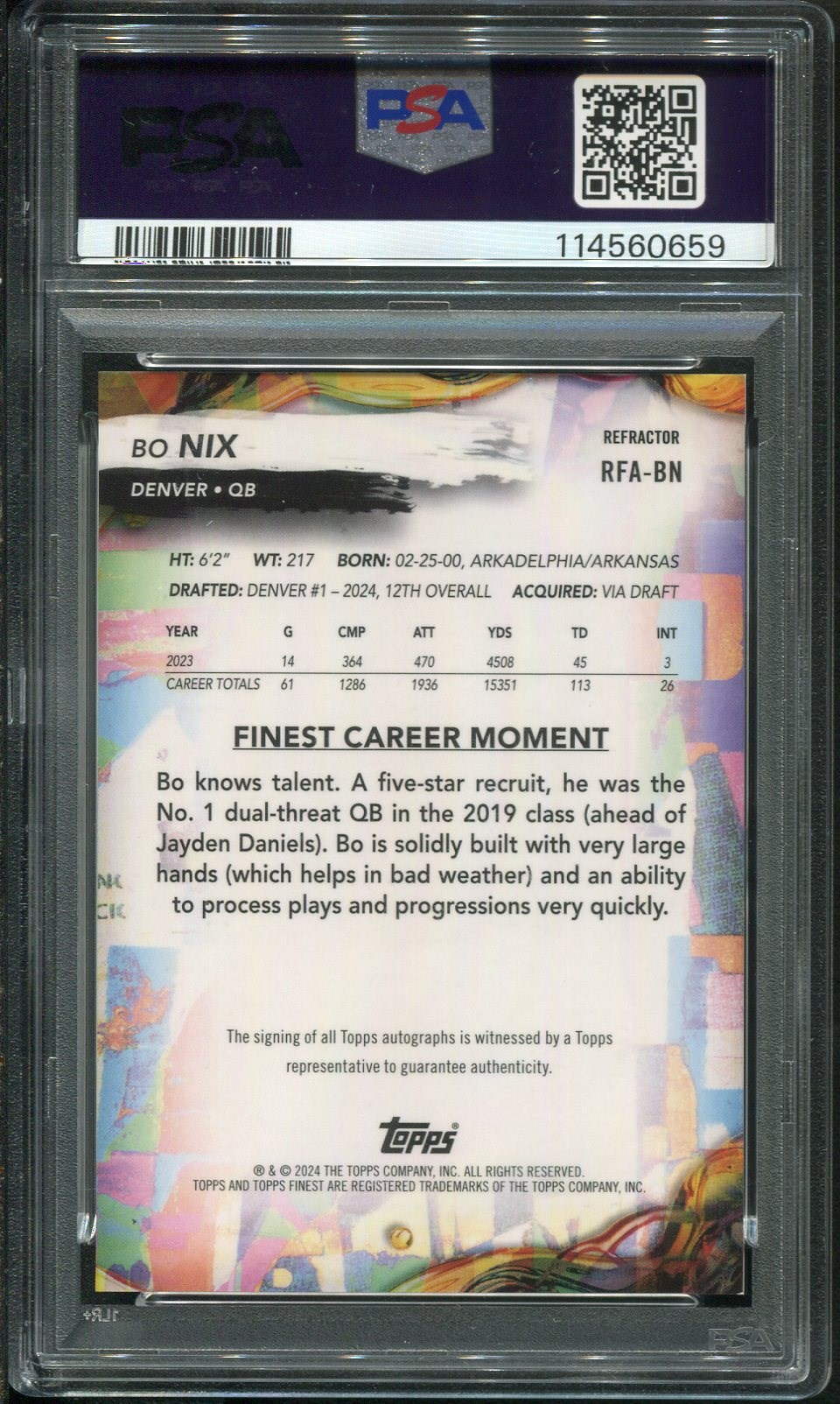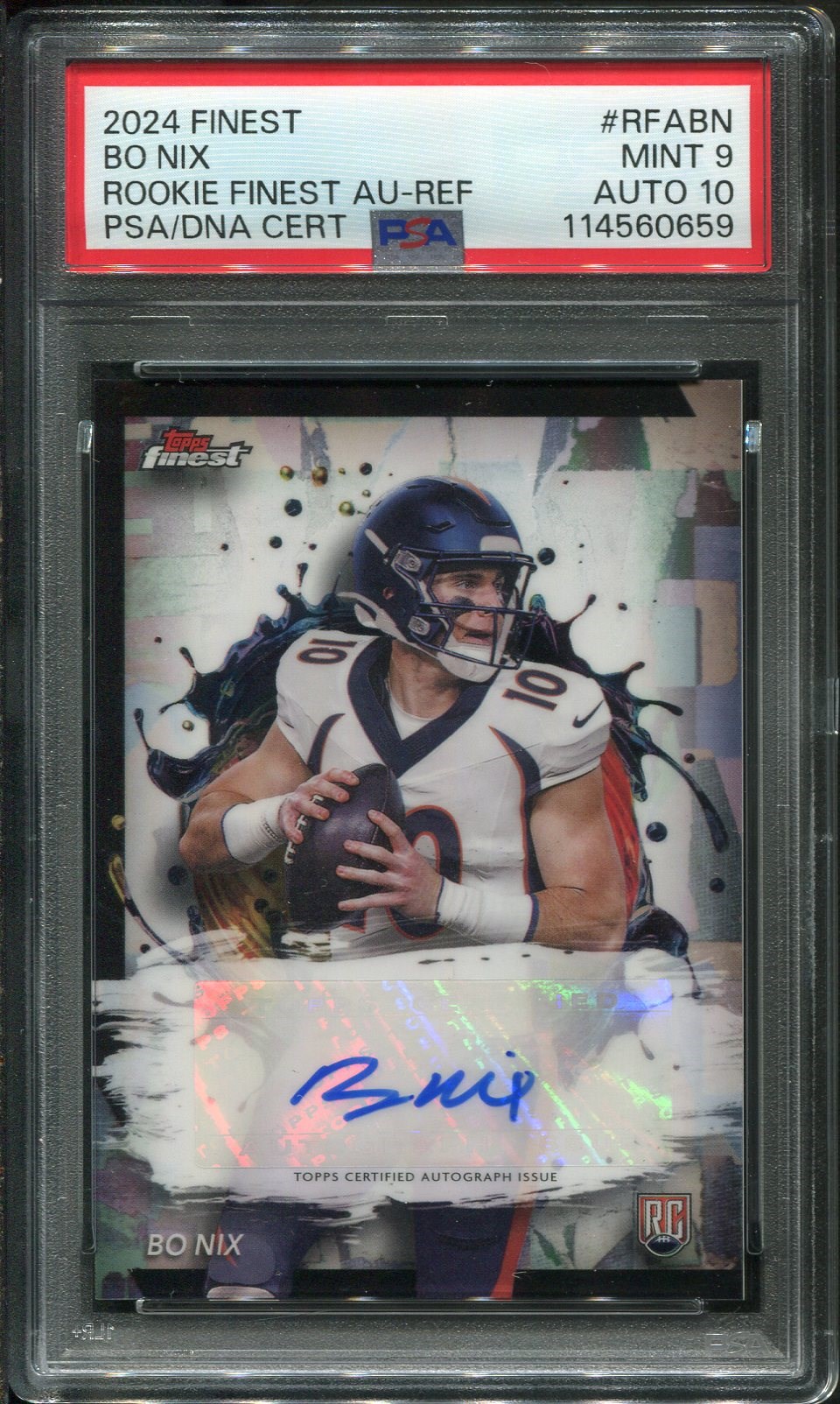 2024 Finest Bo Nix Rookie Autographs Refractor #RFABN PSA 9 with PSA 10 Autograph grade.  A red hot card!  Rookie autographs of young QB's are in high demand, especially a high grade one like this PSA 9/10 beauty.