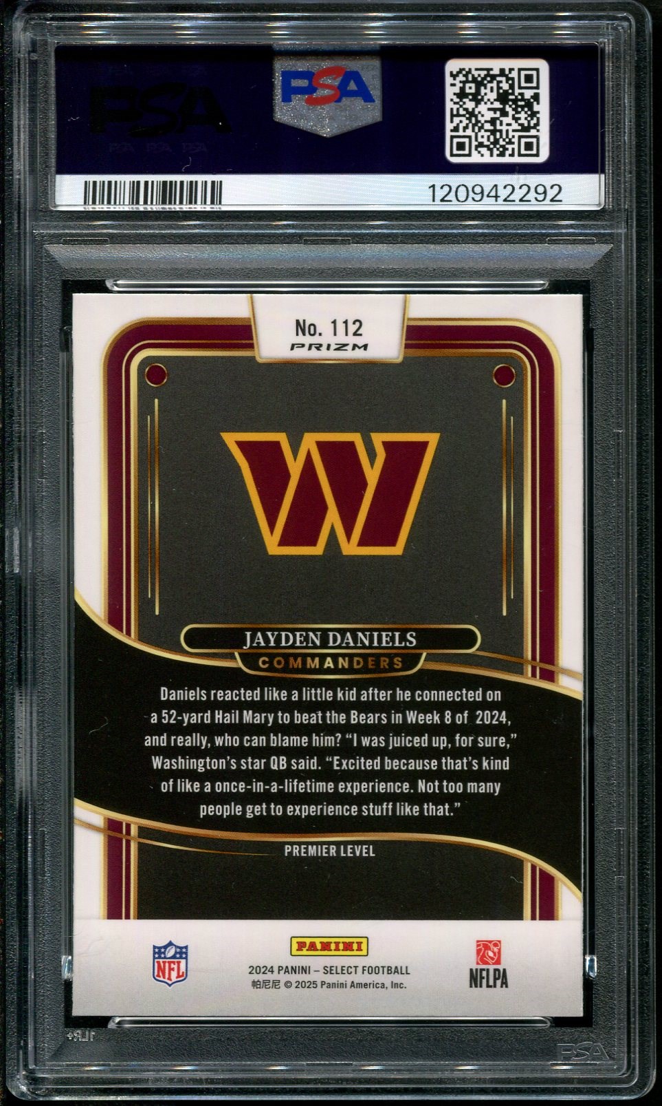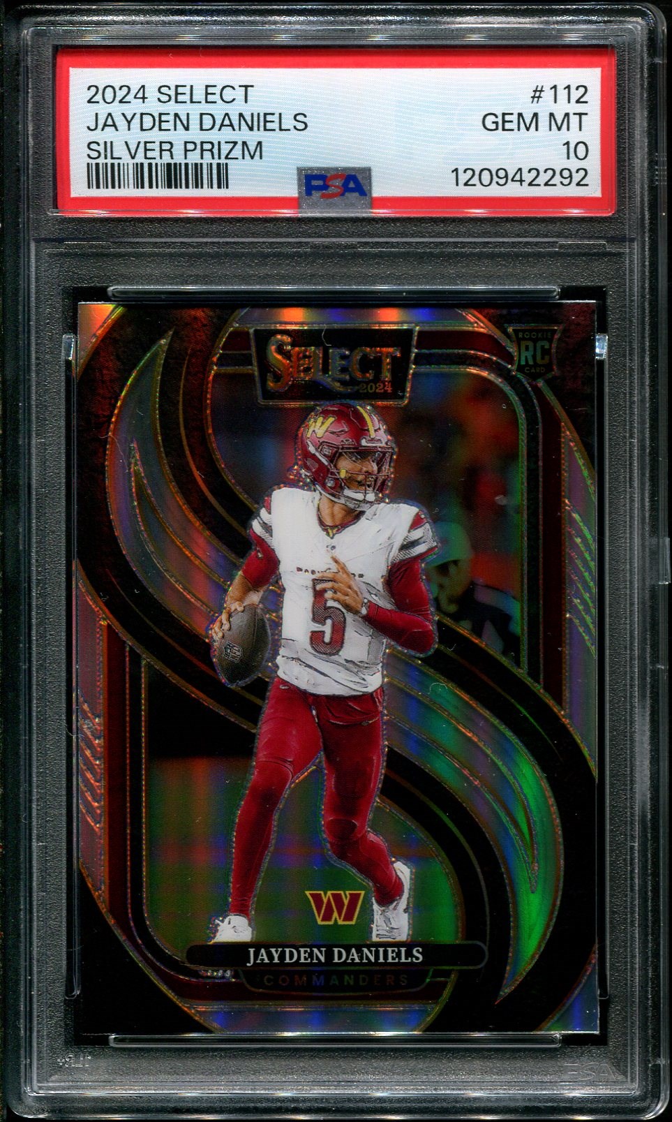 2024 Panini Select Jayden Daniels Silver Prizm RC #112  PSA Gem Mint 10 - Daniels is a great young QB with the ability to make the big play.  Here is his Silver Prizm rookie parallel in PSA 10 grade.