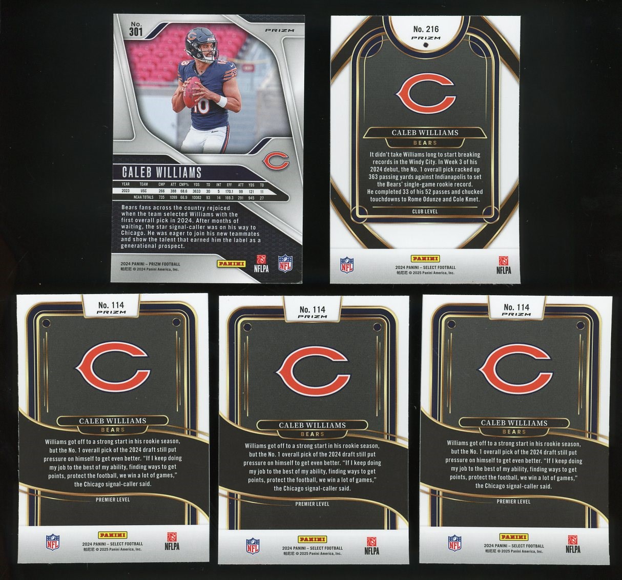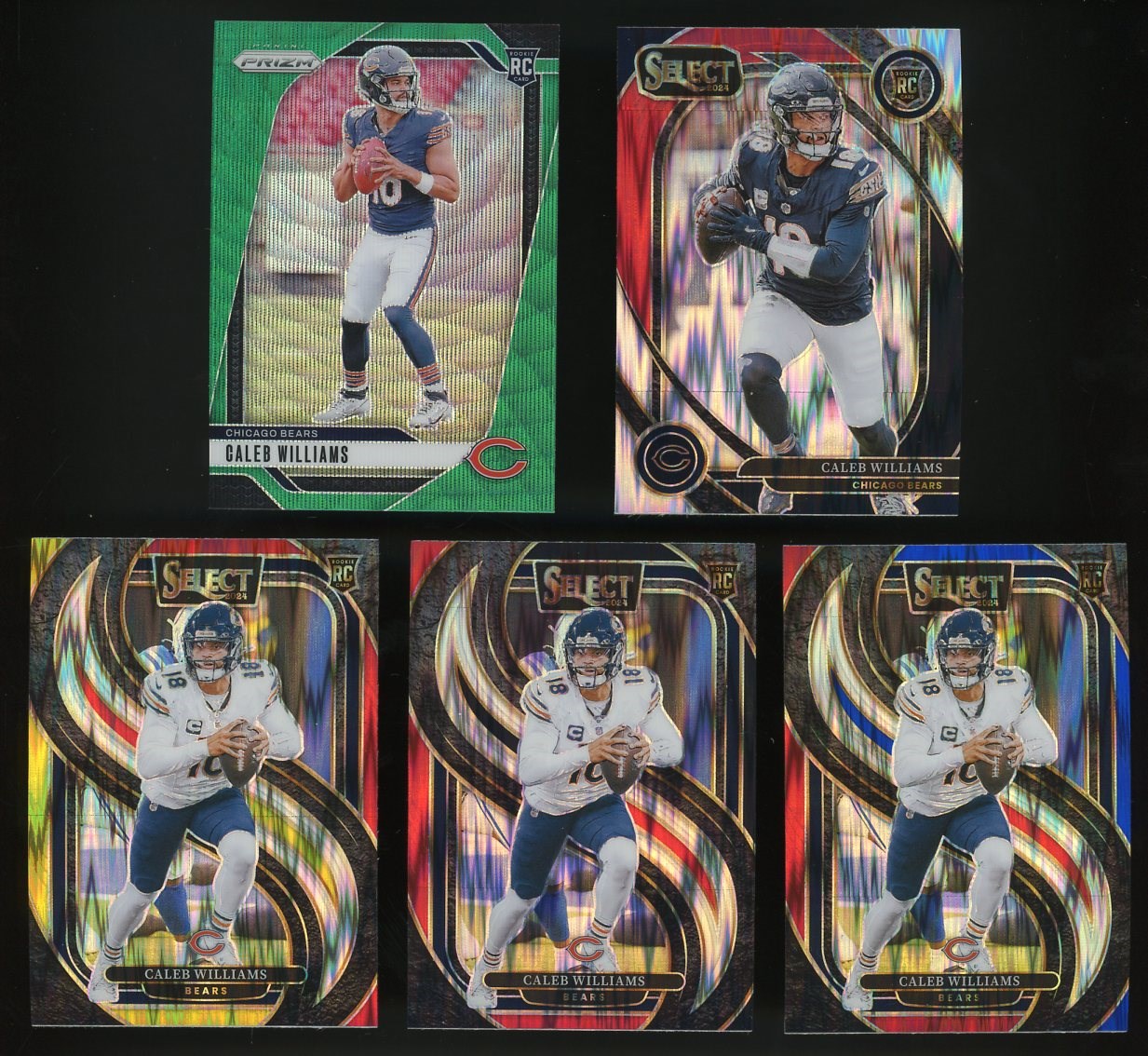 Caleb Williams Lot of 5 Different Rookies (1 Prizm, 4 Select) - Lot includes a 2024 Panini Prizm Green Wave Prizm RC #301, 2024 Select Red & Black Shock Prizm RC #114, 2024 Select Yellow & Red Shock Prizm RC #114, 2024 Select Red & Blue Shock RC #114, and 2024 Select Red & Black RC #216.  All five cards are NM/MT or better.