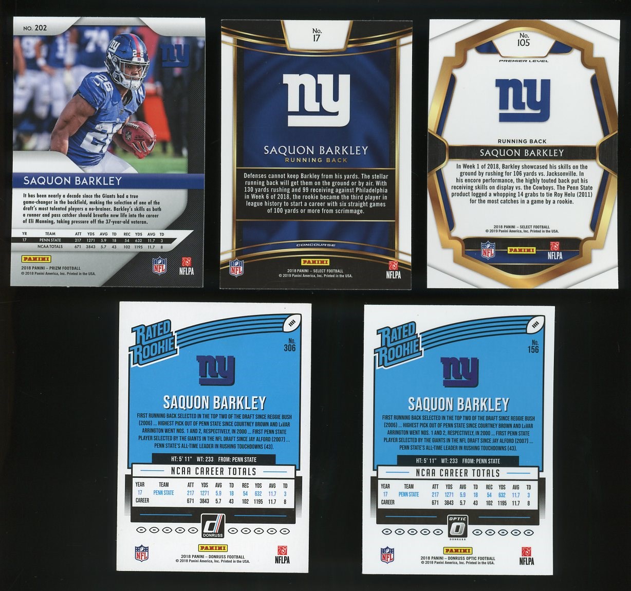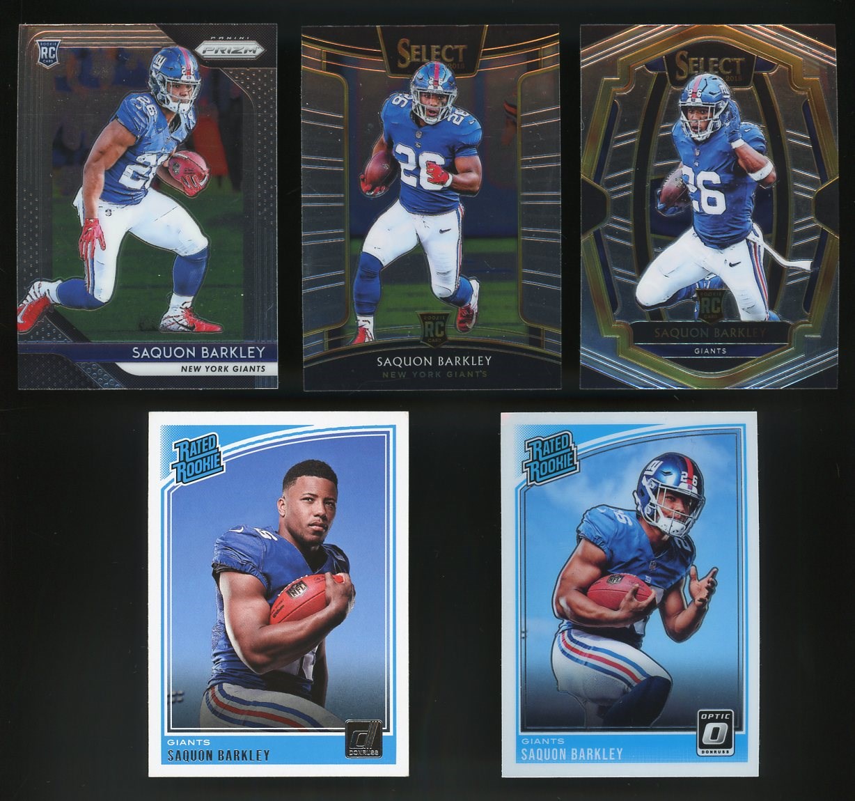 Saquon Barkley Lot of 5 Different Rookie Cards - Lot includes his 2018 Panini Prizm RC #202, 2018 Panini Donruss RC #306, 2018 Panini Donruss Optic RC #156, 2018 Panini Select RC #17 and 2018 Panini Select RC #105. The Optic Rookie is EX and the other four are NM/MT or better.