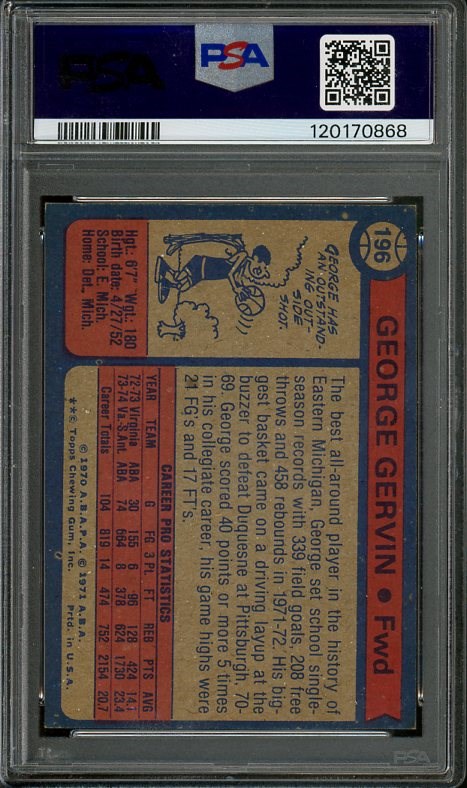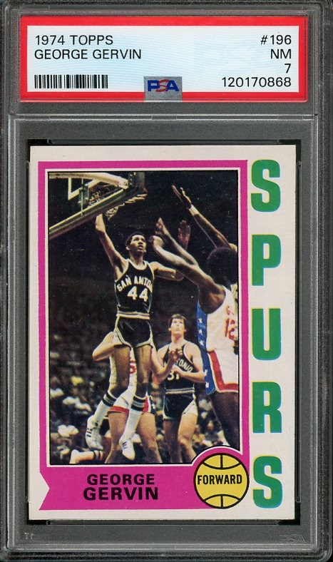 1974 George Gervin 1974 Topps RC #196 PSA NM 7 - Gervin's rookie is one of the key cards in the 1974 Topps set. Here is a nice near-mint PSA 7 to add to your collection.