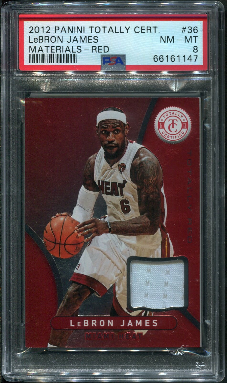 2012 Panini Totally Certified LeBron James Materials Red #36 Game Jersey PSA NM/MT 8 - A nice, white swatch is featured on this 2012 Totally Certified issue.  Card comes in a scratch free PSA holder.