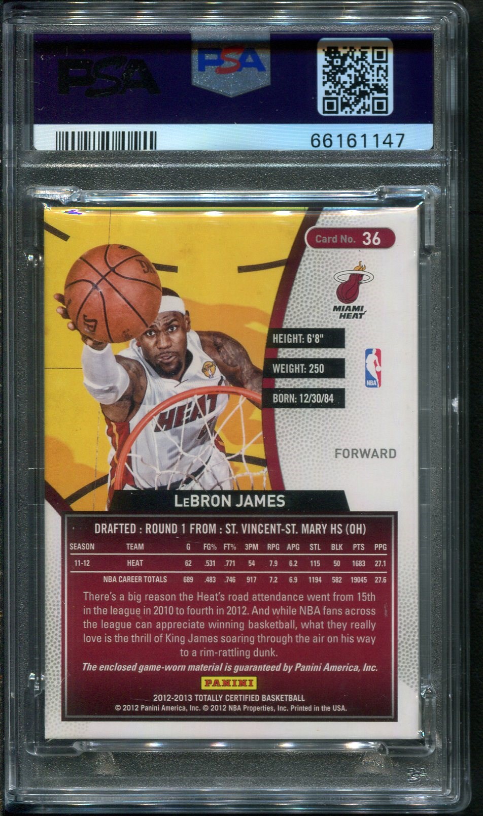 Lot # 472: 2012 Panini Totally Certified LeBron James Materials Red #36 Game Jersey PSA NM/MT 8