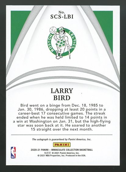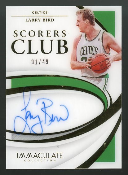 2020 Panini Immaculate Collection Larry Bird Scorers Club Autograph #1/49 - Serial number 1 of just 49 made. A unique item to add to your collection. Card and signature are NM/MT or better.