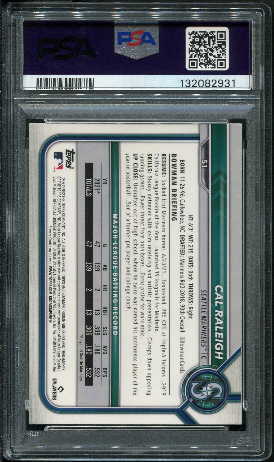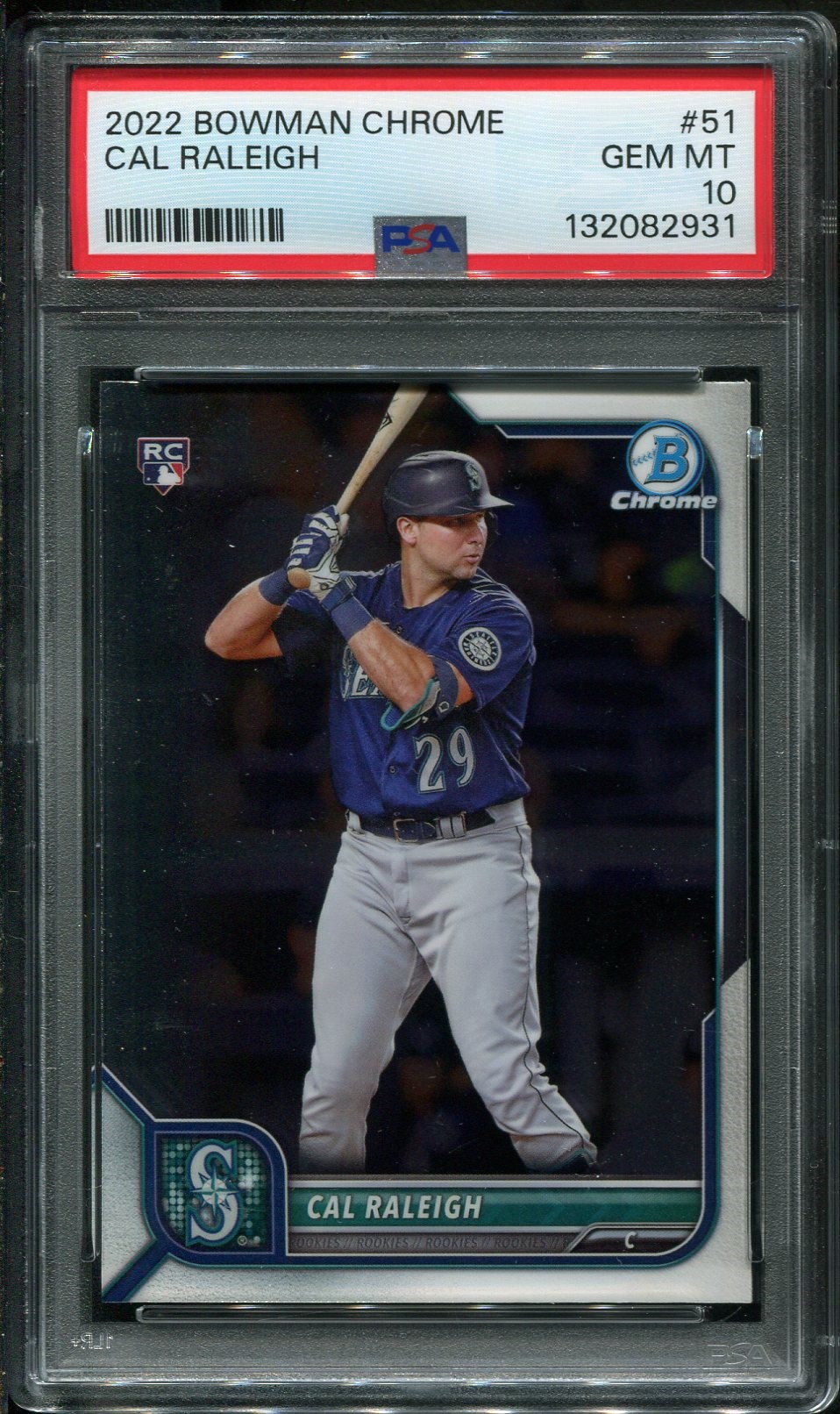 2022 Bowman Chrome Cal Raleigh RC #51 PSA Gem Mint 10 - This was one of the most highly requested cards from the All-Star break to the end of the playoffs. Raleigh really made a name for himself in 2025. Look for him to pick up right where he left off, again next season.