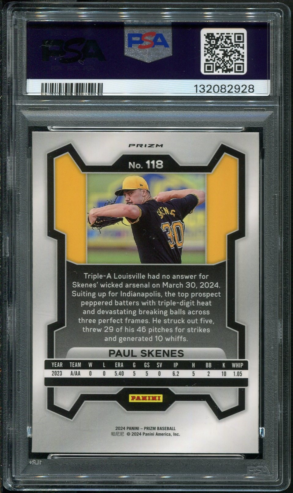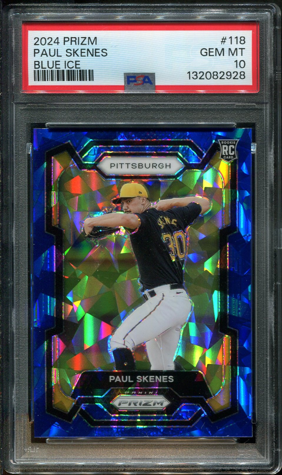 2024 Panini Prizm Paul Skenes Blue Ice Prizm RC #118  PSA Gem Mint 10 (Pop 30) - A highly attractive card with it's bright blue design.  A PSA 10 population of 30 is quite low compared to his other rookie issues.