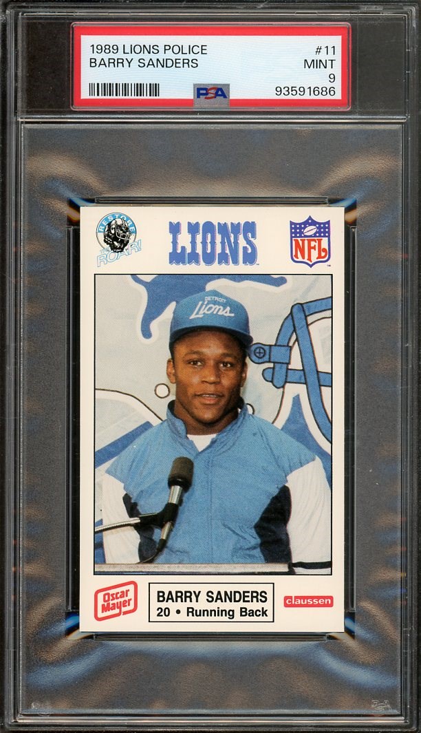 1989 Lions Police Barry Sanders RC #11  PSA Mint 9 - A tough, regional issue of Barry Sanders, this 1989 Lions Police rookie card is tough to find in any grade.