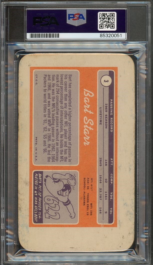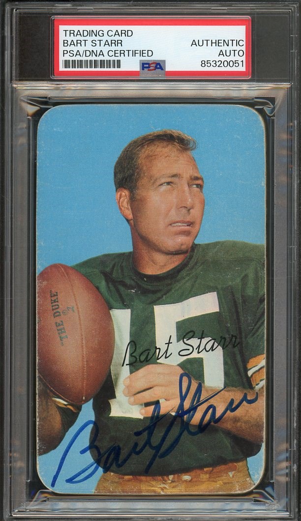 1970 Topps Super Bart Starr #3 Autographed PSA/DNA Authentic - Starr was the greatest quarterback in Packer history winning five championships before retiring in 1971. Here is his signature, signed in blue sharpie and authenticated by PSA/DNA.
