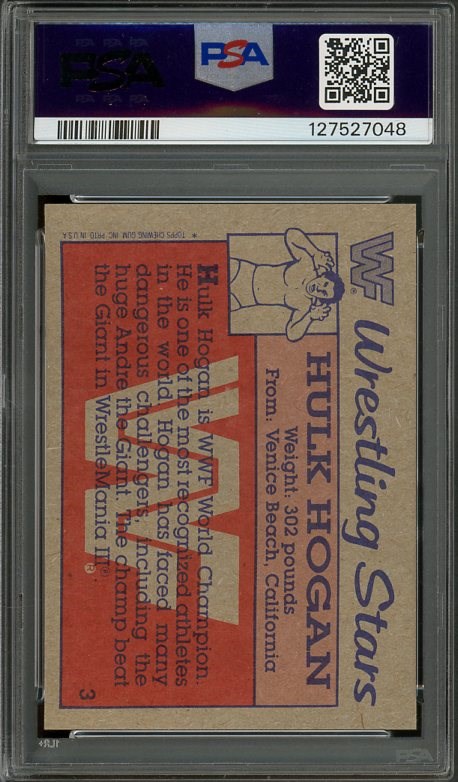 1987 Topps WWF Hulk Hogan #3  PSA NM/MT 8 - Hogan was one of the original wrestling pioneers helping to grow the WWF to new heights.  Here is a condition sensitive Hogan card in NM/MT condition.