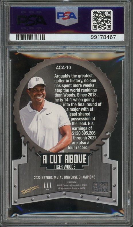 Lot # 511: 2022 Metal Universe Tiger Woods A Cut Above Die-Cut #10 PSA NM/MT 8