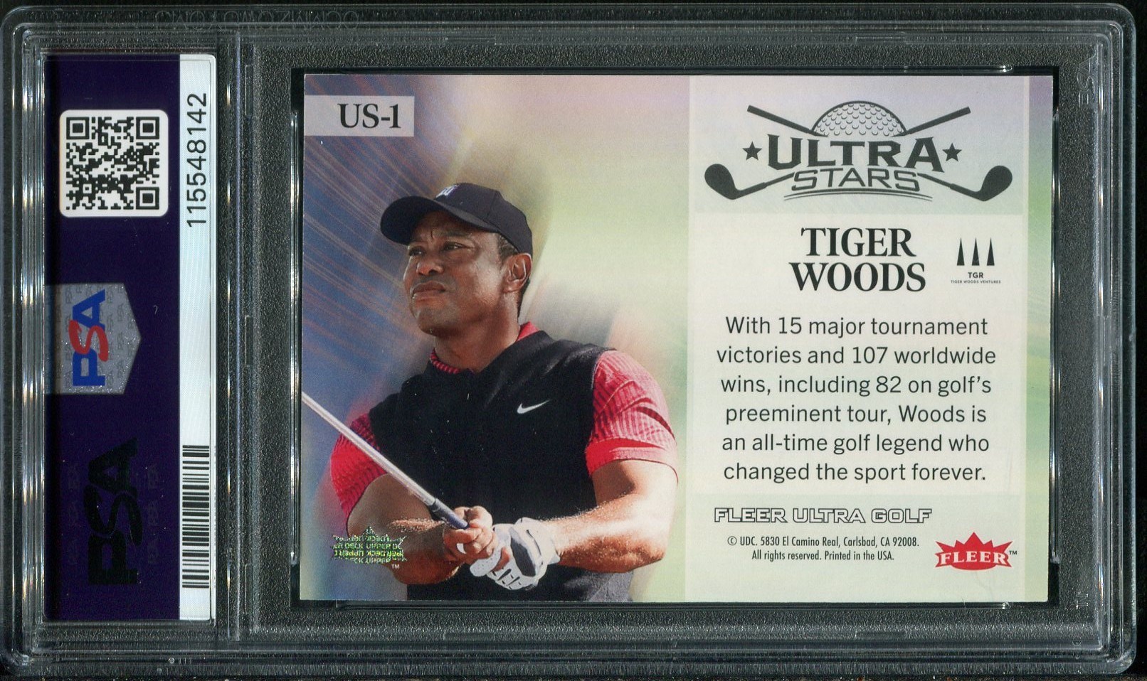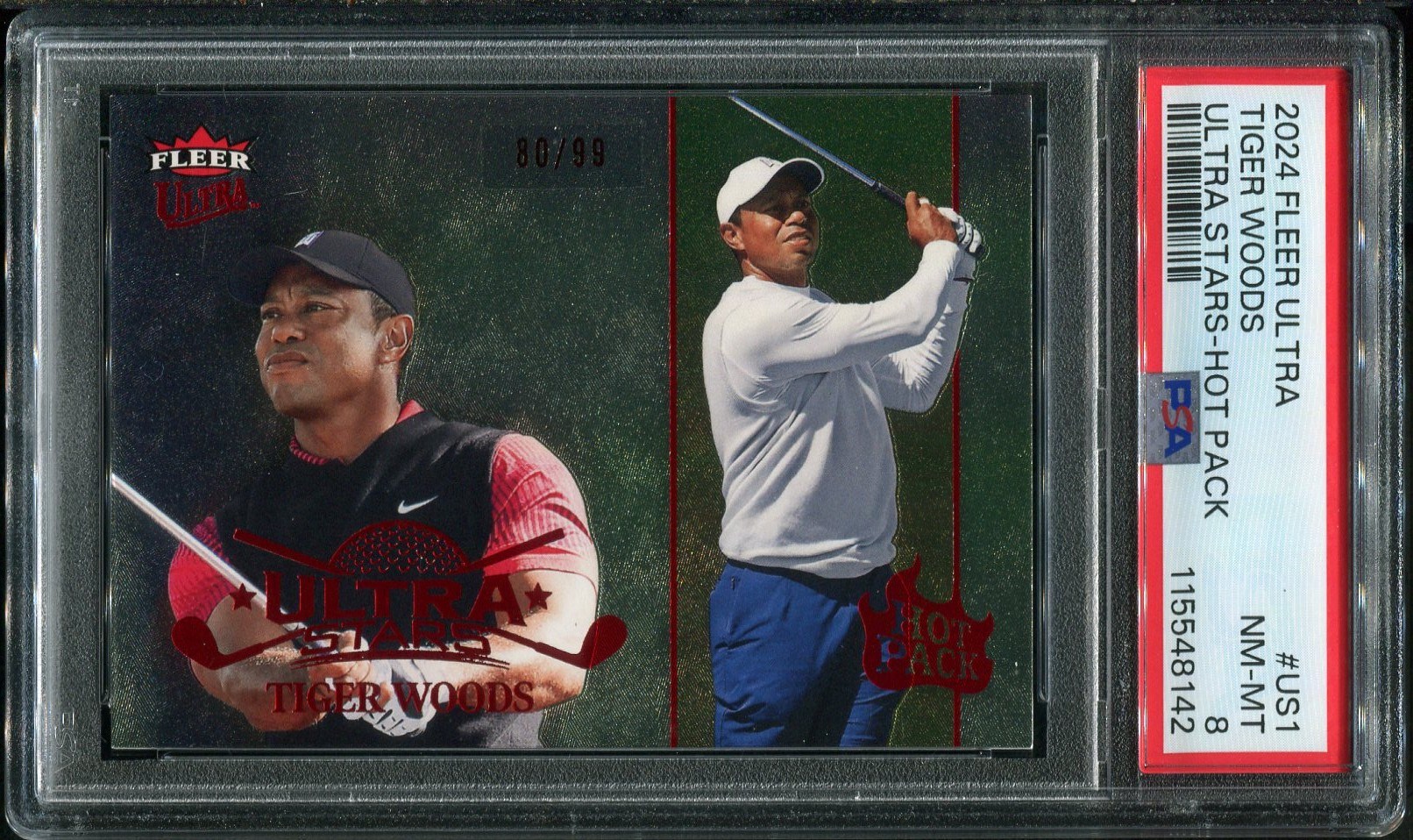 2024 Fleer Ultra Tiger Woods Ultra Stars Hot Pack #US1 #'d/99 PSA NM/MT 8 - Serial numbered out of just 99 made, this Tiger Woods is tough to find in high grade, due to the foil surface design.