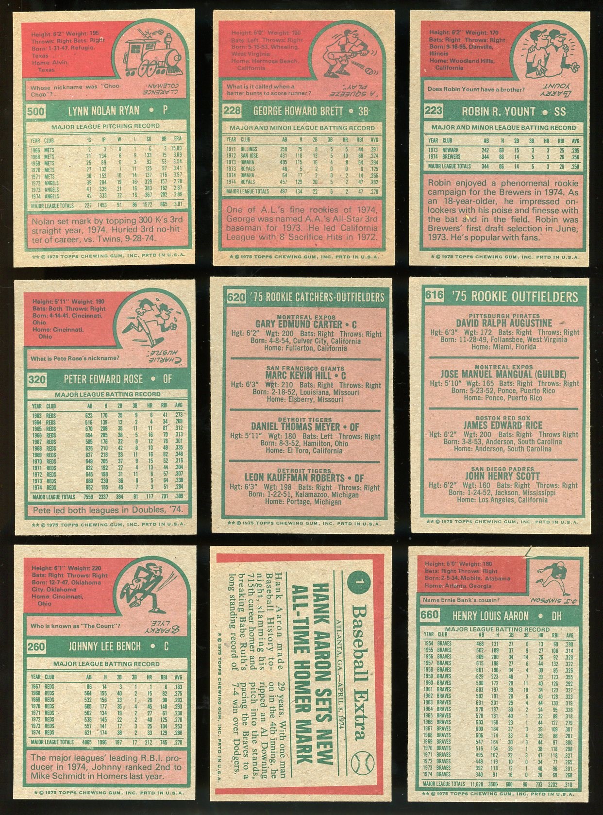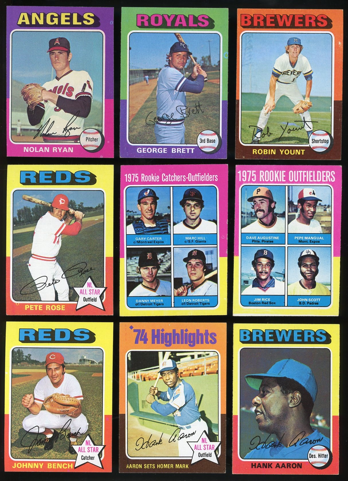 1975 Topps Baseball Complete Set - A solid set with most of the cards being in the EX to EX/MT range. There are a few better and a few worse. The Bench is really nice, with the Ryan and Yount being clean, but off center. Zoom in on the scan for a more detailed look.
