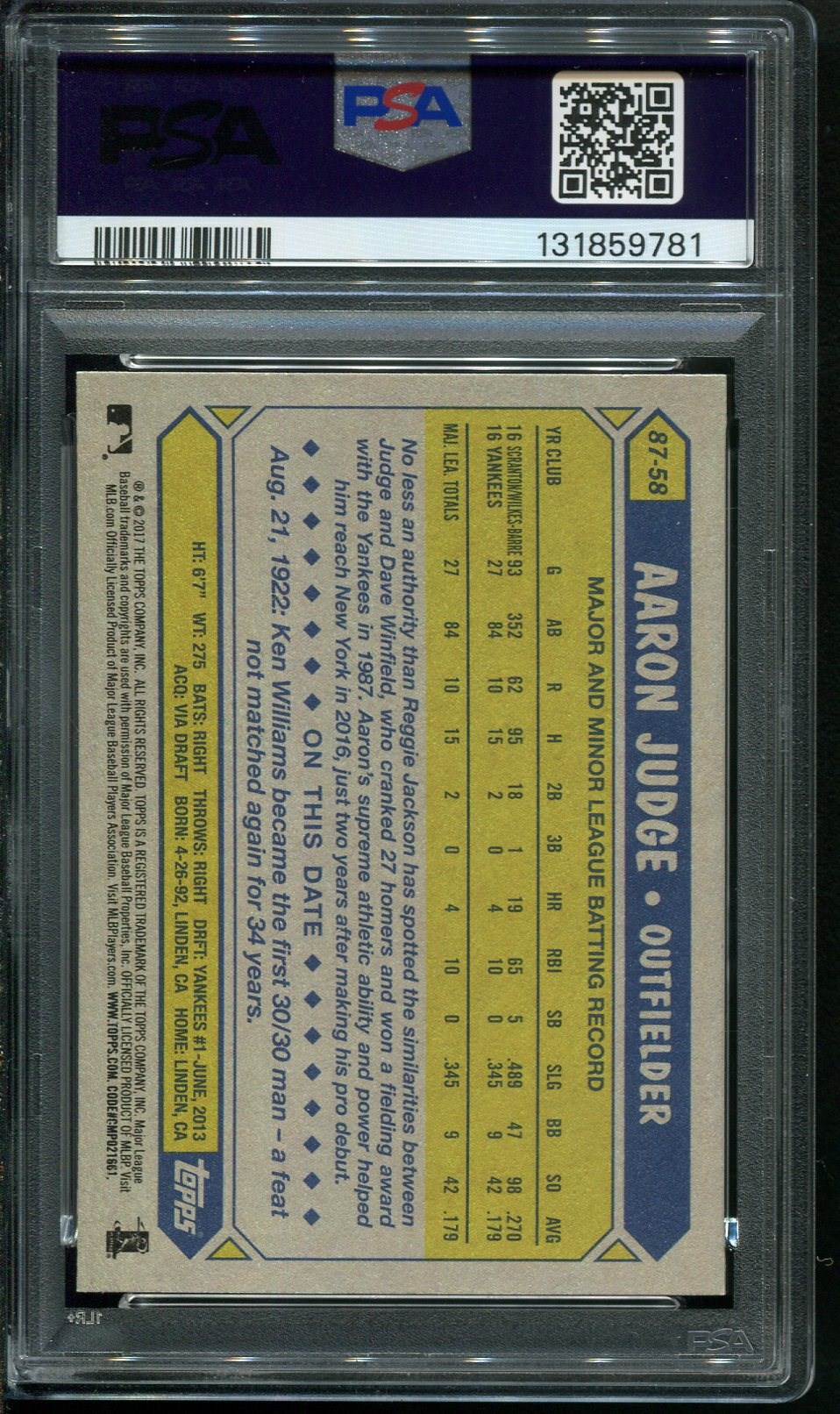 Lot # 269: 2017 Topps Aaron Judge 1987 Topps RC #87-58 PSA Mint 9