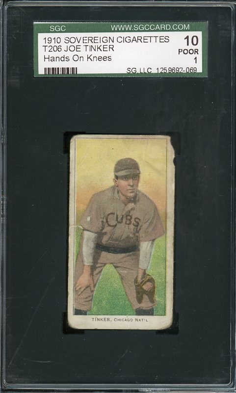 1909-11 T206 Joe Tinker (Hands on Knees, Sovereign Back) SGC 1 - Card features a tougher Sovereign back compared to the standard Piedmont or Sweet Caporal versions.
