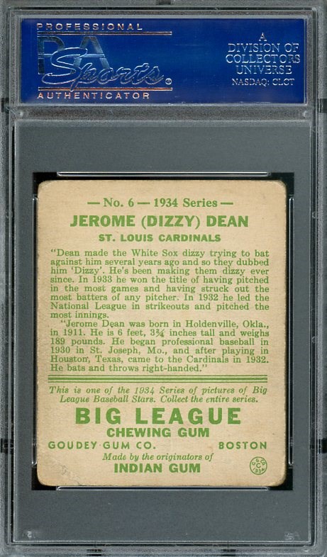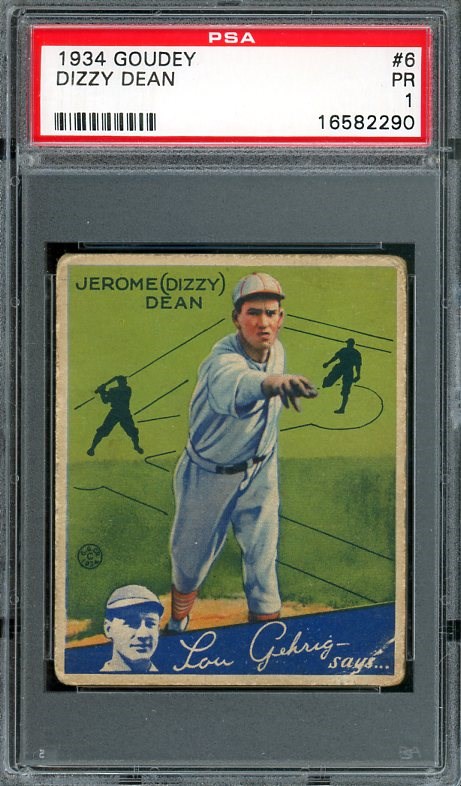 1934 Goudey Dizzy Dean #6  PSA Poor 1 - Well centered with strong color, this Dean card has corner wear and a crease in the lower right quadrant, which contributes to the overall grade.