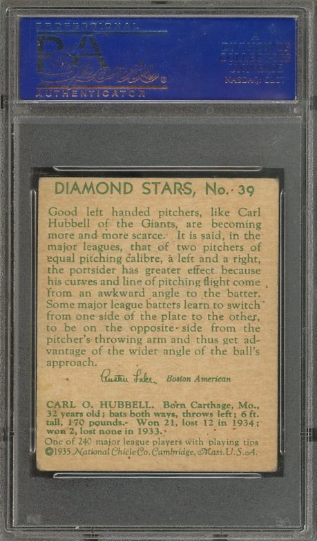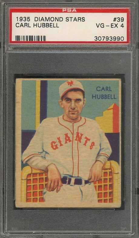 1935 Diamond Stars Carl Hubbell #39 PSA VG/EX 4 - Hubbell was a two time MVP and won 99 games more than he lost (253-154). He was inducted to the Hall of Fame in 1947. Here is a solid mid grade card of Hubbell from the 1934-36 Diamond Kings set.