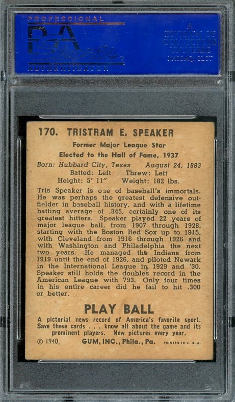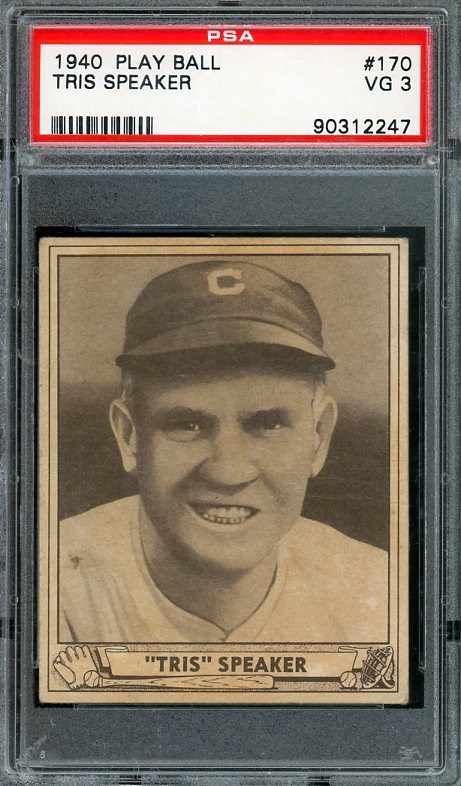 1940 Play Ball Tris Speaker #170 PSA VG 3 - Card has nice eye appeal and is very well centered. His 3,514 career hits ranks him fifth all-time. He finished his career with a .345 batting average.