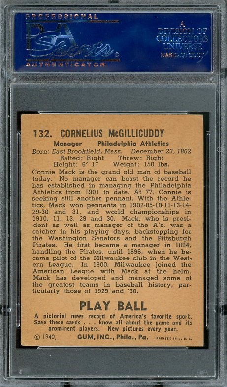 1940 Play Ball Connie Mack #132 PSA VG/EX 4 - Card is crease free with some corner wear and centering that contribute to the overall grade.