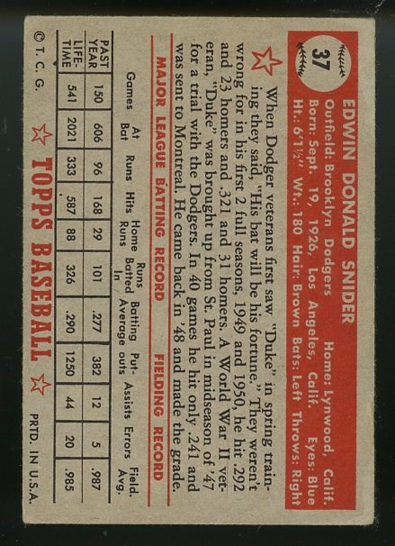 1952 Topps Duke Snider #37 - Nice centering and strong color on this 1952 Snider, however there are two creases coming off the boarder and corner wear.  Overall Fair to Poor.