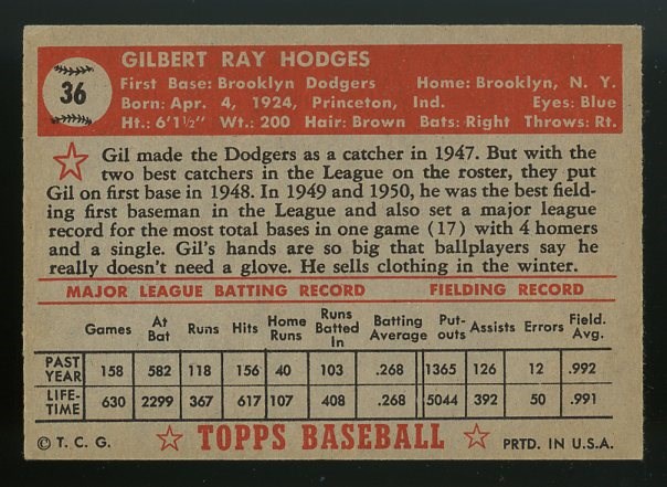 1952 Topps Gil Hodges #36 - Card is crease free, but there is an indention in the surface near his bat.  Otherwise, free of major defects with some corner wear and a centering issue top to bottom.  Overall VG.