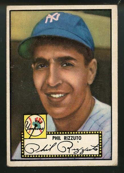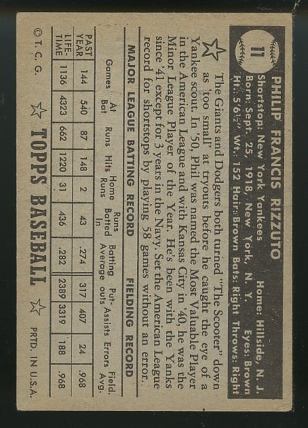 1952 Topps Phil Rizzuto #11 (Black Back) - This is the tougher black back version of Rizzuto, with the card having corner wear and the surface is creased to the left of his hat. Overall Fair to Good.