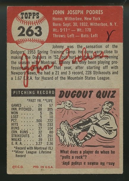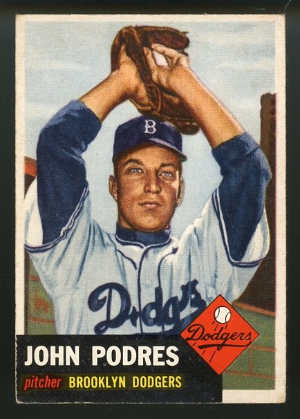 1953 Topps Johnny Podres RC #263 - Podres is one of the key rookie cards in the 1953 Topps set. A tough card to find coming from the high series, this example has great centering and color, but does have a crease in the upper right part of the card. The card also has a small mark on the back. Overall Fair.
