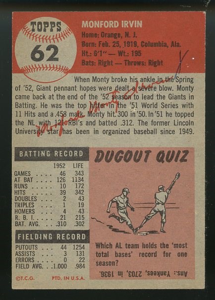1953 Topps Monte Irvin #62 - Card is free of creases, has strong color and registration, but does have a small mark on the back.  A strong card that falls into the VG/EX range.