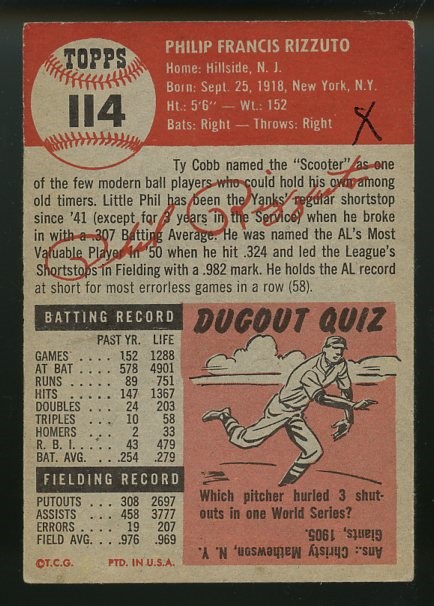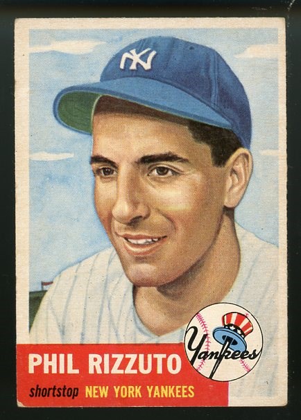 1953 Topps Phil Rizzuto #114 - Nice centering and strong color highlight this '53 Rizzuto. Card is free of creases, but does have corner wear and a small mark on the back.