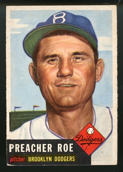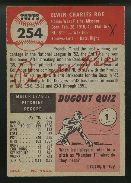 1953 Topps Preacher Roe #254 - A tough card to find, as this Preacher Roe card was issued in the 1953 high series. Card has a clean front with no creases and moderate corner wear. The reverse does have a small mark in the upper right area. Overall VG+.