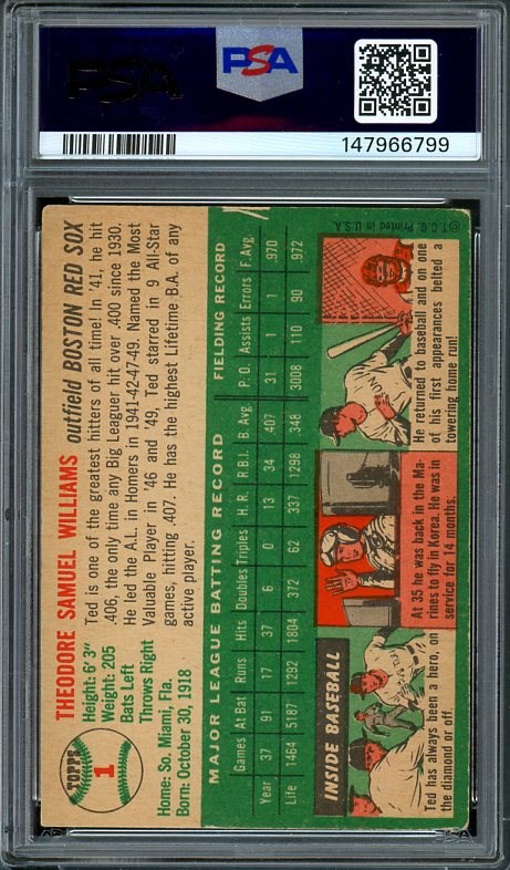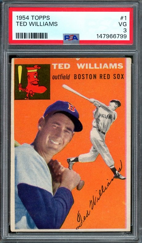 1954 Topps Ted Williams #1  PSA VG 3 - Being the first card in the set, the Williams card is a bit more condition sensitive.  This example has nice centering and is crease free.  Some corner wear and edge wear at the top contribute to the overall grade.