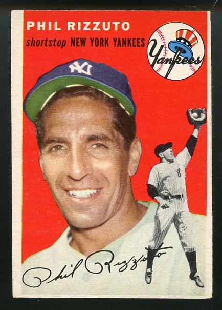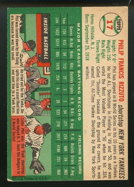1954 Topps Phil Rizzuto #17 - A clean card with no major flaws. Card is a bit off center with mild corner wear. A solid card that falls in the VG/EX range.