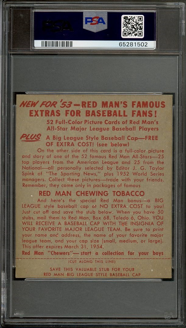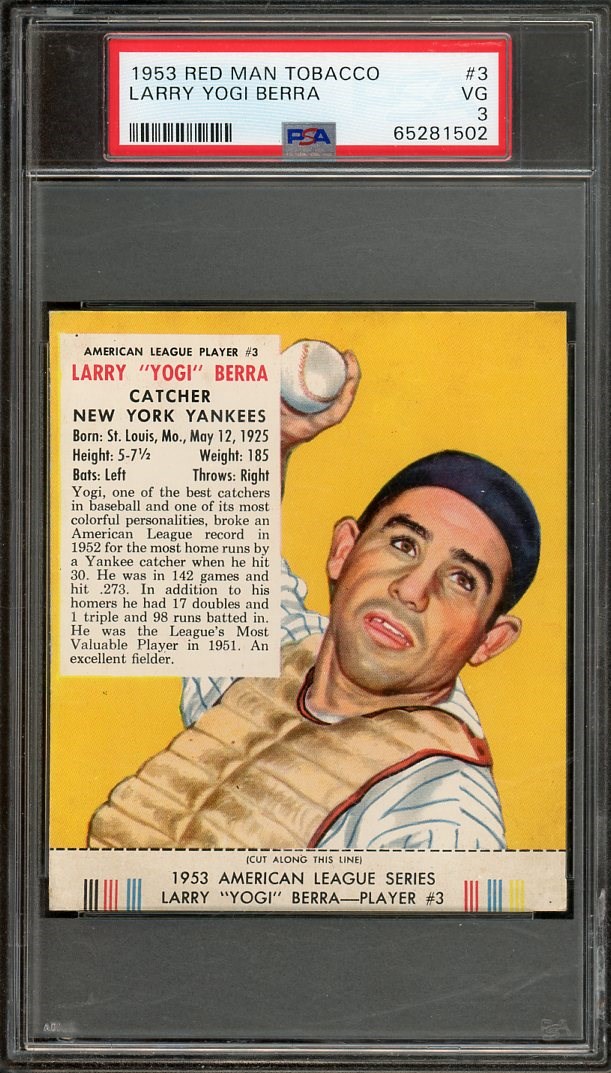 1953 Red Man Tobacco Yogi Berra #3 (With Tab)  PSA VG 3 - Card still retains it's original tab at the bottom of the card.  This Berra has strong color and great registration.  A must have item for the Berra collector.