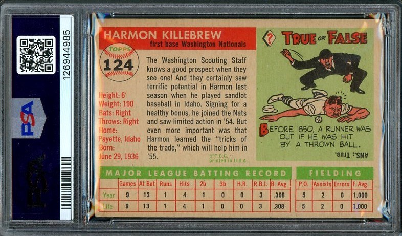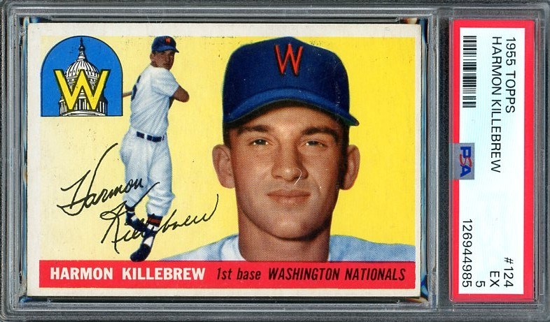 1955 Topps Harmon Killebrew RC #124  PSA EX 5 - This Killebrew rookie was recently graded and comes in a new PSA holder.  The card has great color, registration and nice corners, with centering being the main contributor to the overall grade.