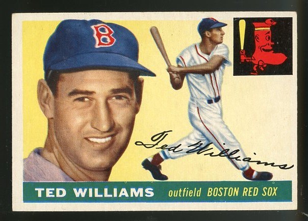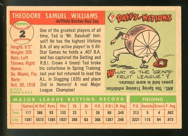 1955 Topps Ted Williams #2 - Up for auction is an attractive Ted Williams card from the 1955 Topps set. Card is crease free with no major flaws. There is some edge wear on the top border, with mild corner wear. Overall VG to VG+.