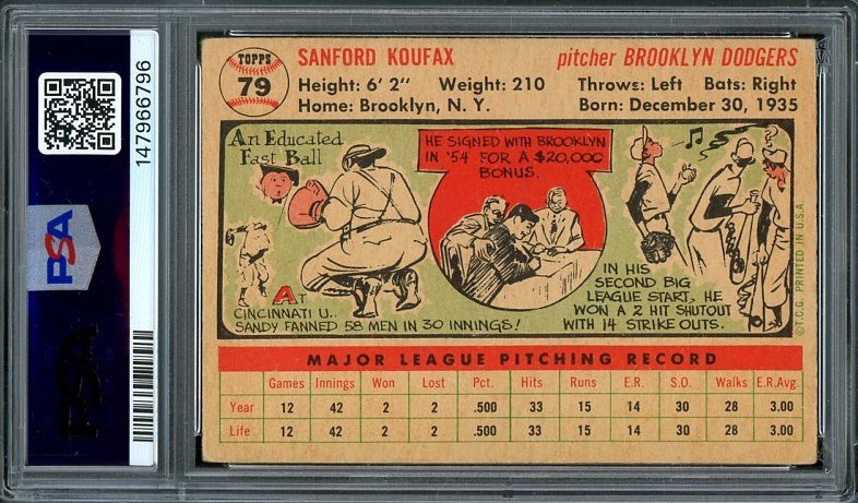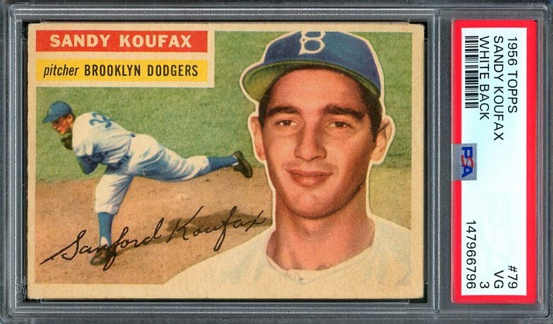 1956 Topps Sandy Koufax #79 (White Back) PSA VG 3 - An attractive card of Koufax, this 1956 Topps was recently graded and comes in a new PSA holder. Some light toning and corner wear contribute to the VG grade.