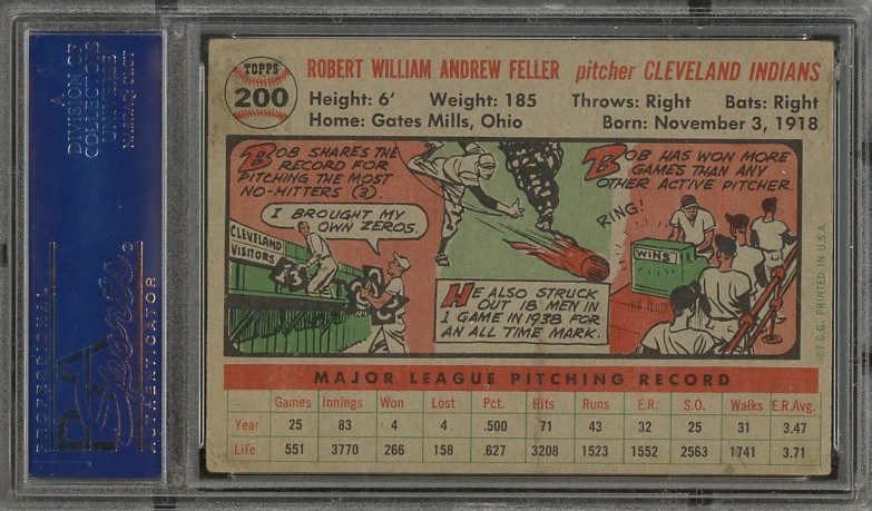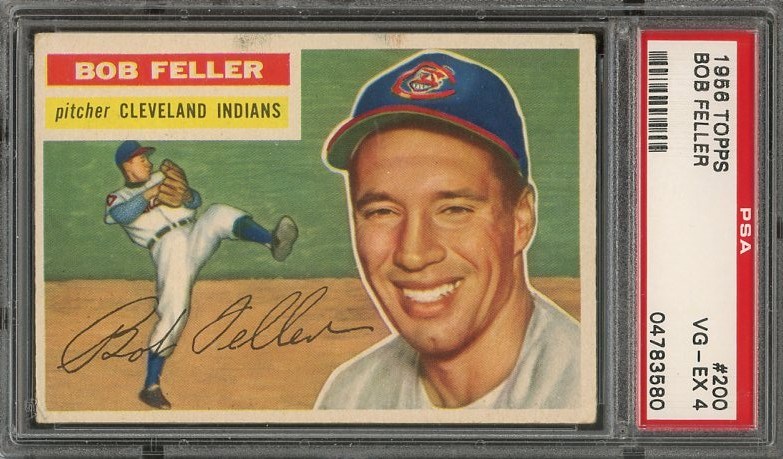 1956 Topps Bob Feller #200 PSA VG/EX 4 - Card is crease free with no major flaws. Card has corner wear and a couple of print spots at the top of the card.