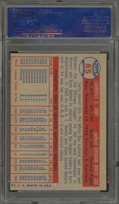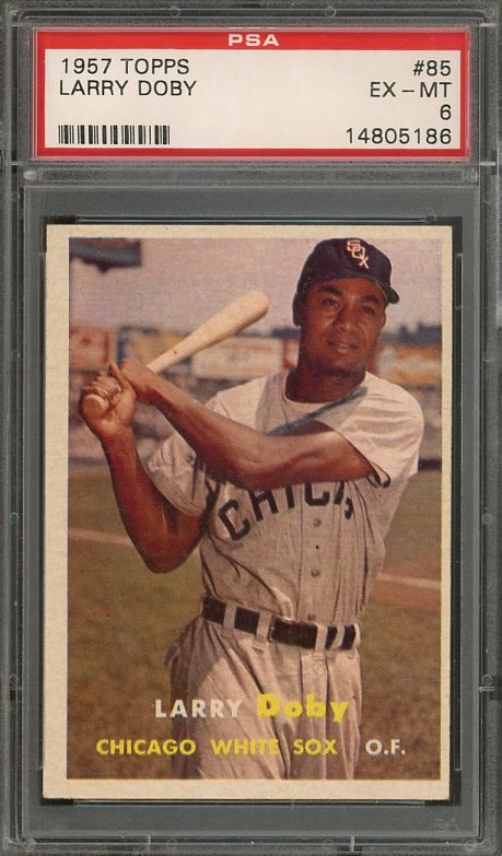 1957 Topps Larry Doby #85 PSA EX/MT 6 - A nice mid grade card with strong corners, color and registration. Side to side centering contributes to the EX/MT grade.
