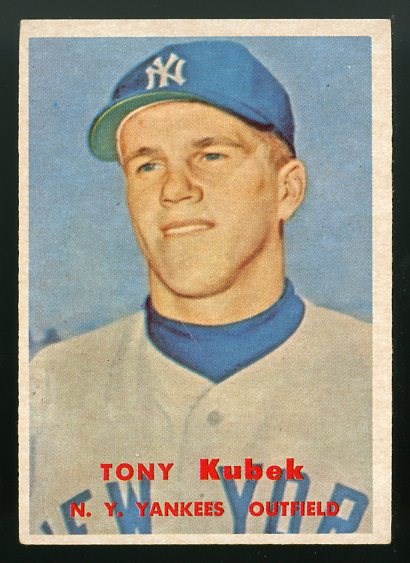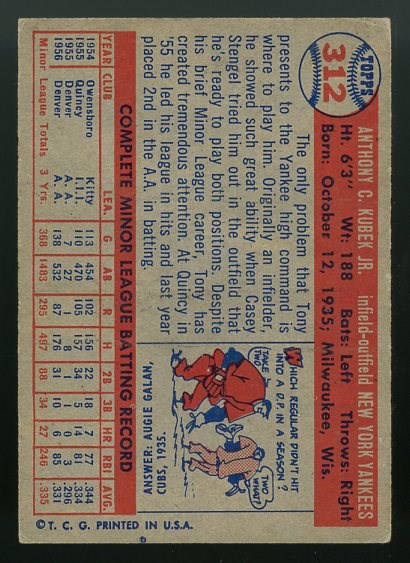 1957 Topps Tony Kubek RC #312 - Here is an attractive Tony Kubek rookie card from the 1957 Topps set. The card is crease free with no major flaws. Corner wear and a mild centering issue contribute to the VG/EX grade.