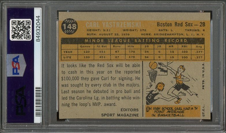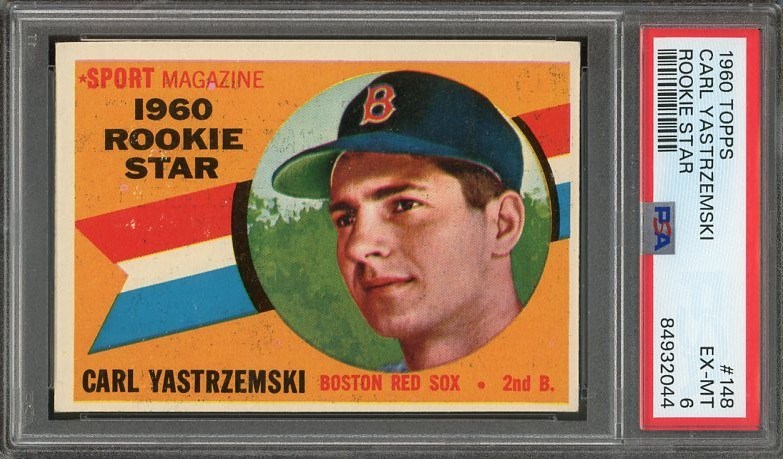 1960 Topps Carl Yastrzemski RC #148 PSA EX/MT 6 - Here is a mid grade Yastrzemski rookie with strong corners. The Yaz rookie is one of the key cards in the 1960 Topps set. Hall of Fame rookie cards are always in demand.