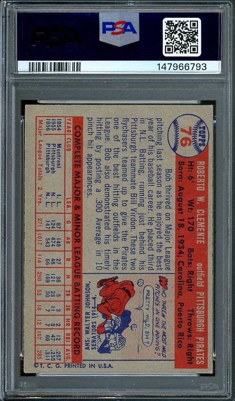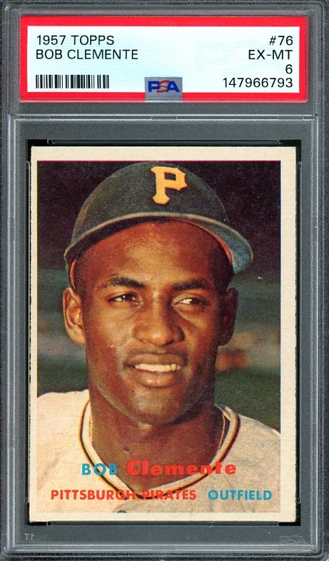 1957 Topps Roberto Clemente #76 PSA EX/MT 6 - This Clemente has exceptional color and strong corners. The card was recently graded and comes in a new PSA holder.