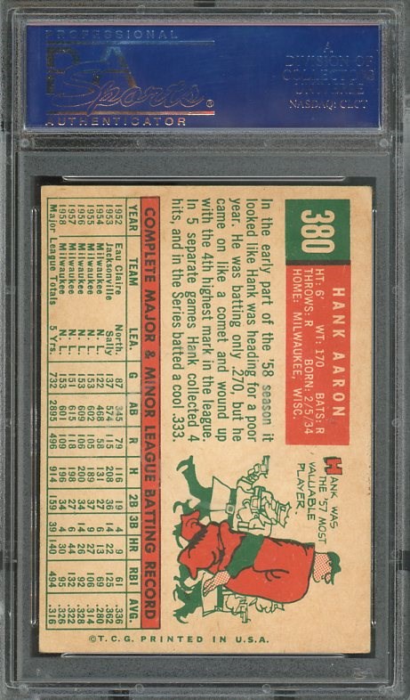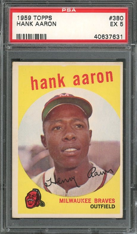 1959 Topps Hank Aaron #380  PSA EX 5 - Up for auction is a nice PSA EX 5 Hank Aaron.  Card has nice corners and color with centering being the main contributor to the overall grade.