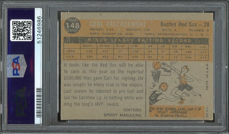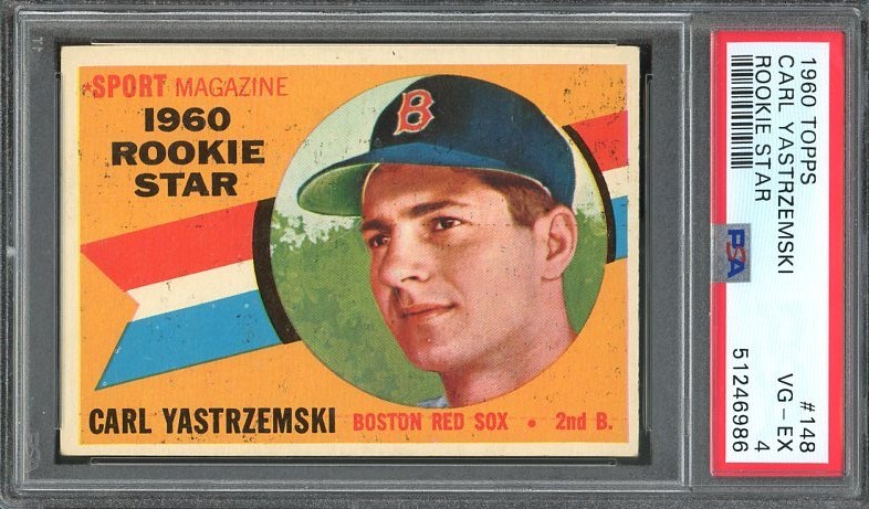 1960 Topps Carl Yastrzemski RC #148  PSA VG/EX 4 - Yastrzemski was an 18 time All-Star who played his entire career for the Red Sox.  He won the Triple Crown in 1967 and finished his career with 3,419 hits.  Card is crease free with corner wear and some print spots that contribute to the overall grade.
