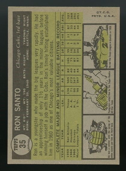 1961 Topps Ron Santo RC #35 - Here is a really nice Ron Santo rookie card with exceptional centering and nice corners.  Conservatively graded at EX/MT, this one would go well in any mid to high grade set.