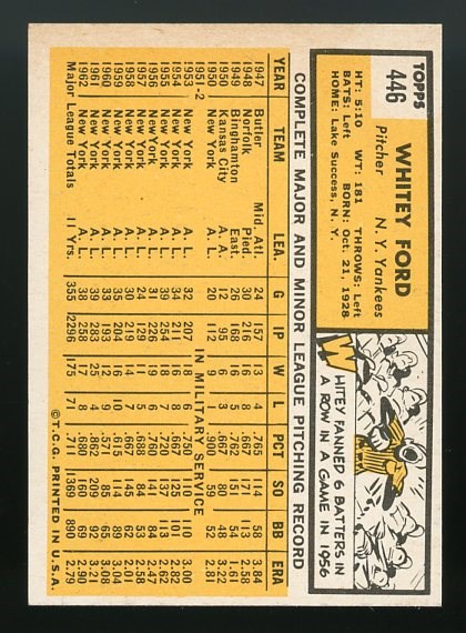 1963 Topps Whitey Ford #446 - A sharp card with very little wear.  Card has great color with centering and some light print spots that contribute to the EX/MT grade.