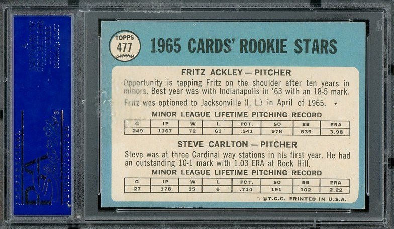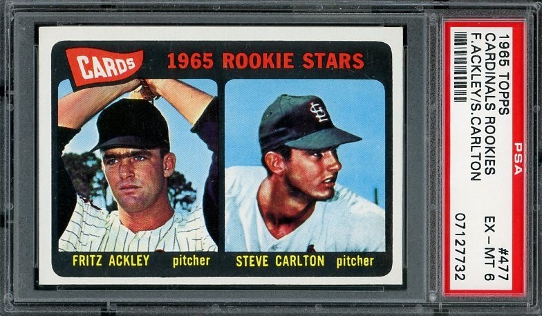1965 Topps Steve Carlton RC #477 PSA EX/MT 6 - A very clean card with very few issues. Card is slightly off center top to bottom, but still maintains the look of a card with a higher grade. Strong color that really pops against the white borders.
